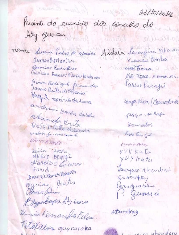Nós, lideranças Guarani, Kaiowá, Terena e Kinikinau, reunidos na Terra Indígena de Guyraroká, no Grande Conselho da Aty Guasu, anunciamos que
